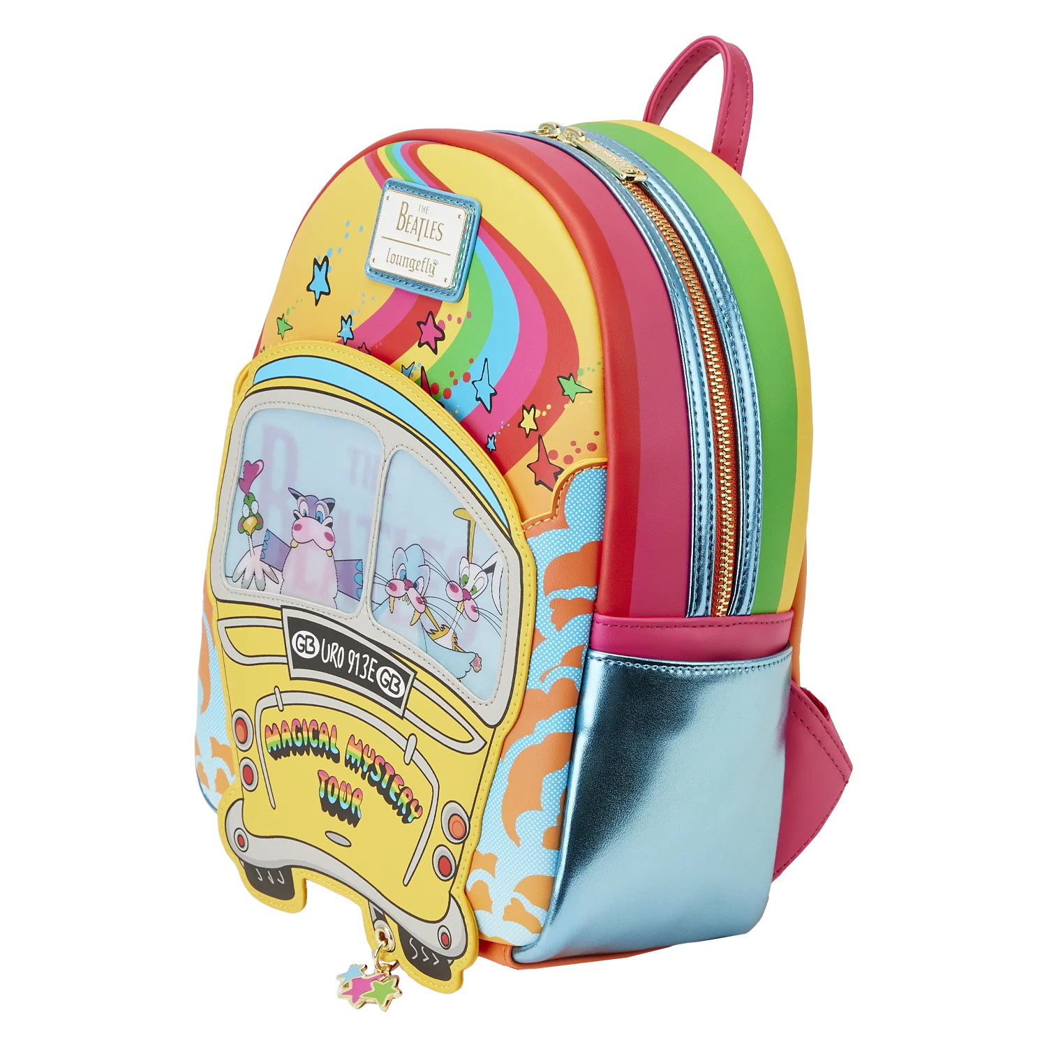 The Loungefly x The Beatles Magical Mystery Tour Bus Mini Backpack is made of vegan leather (polyurethane). Bag has adjustable shoulder straps and shiny gold hardware. Additional features include applique, embossed, lenticular, and printed details. Take note of the coordinating inside lining.