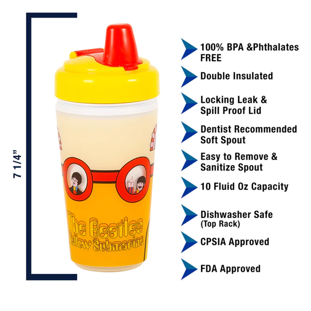 This rockin' sippy cup is perfect for your rockin' baby. Celebrate the album and film with an insulated Yellow Submarine Sippy Cup by The Beatles. It has a locking spill-proof lid, an easily-clean soft spout, and is made of strong, durable plastic.
